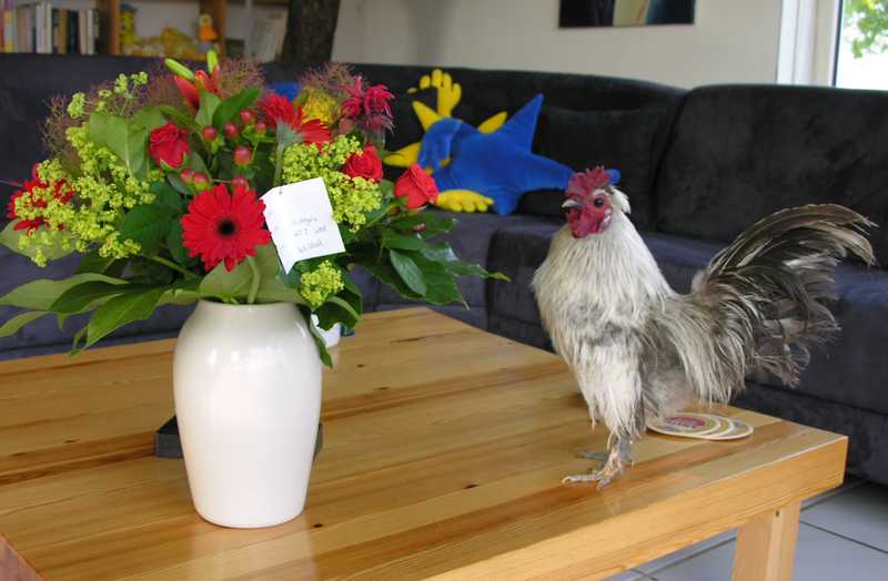 Zelfs onze haan was onder de indruk van de welkomstbloemen, wij ook uiteraard. | En